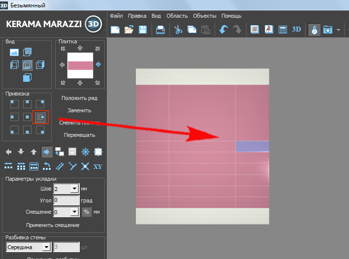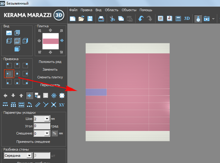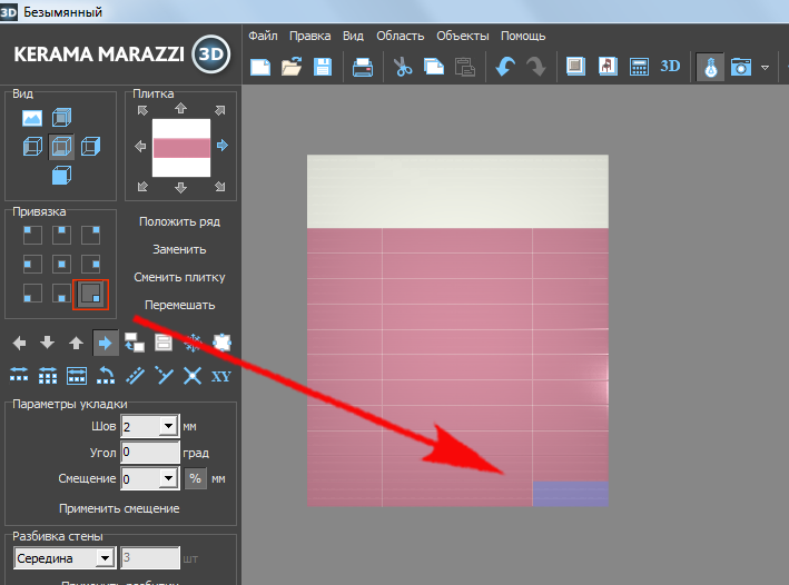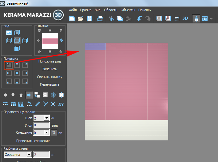 По умолчанию, привязка настроена на левый нижний угол, т.е. первая целая плитка первого ряда укладывается снизу слева.